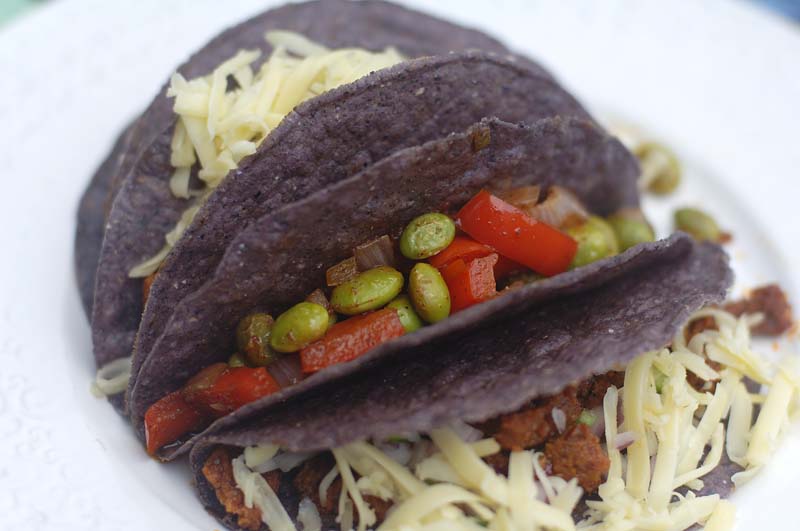 Veggie chorizo tacos with havarti cheese, mixed with edamame, red pepper, and red onion tacos and a McClure's Bloody Mary with Tanqeray vodka. Gary looks hungry but he's dreaming if he thinks I'm sharing my food with him!